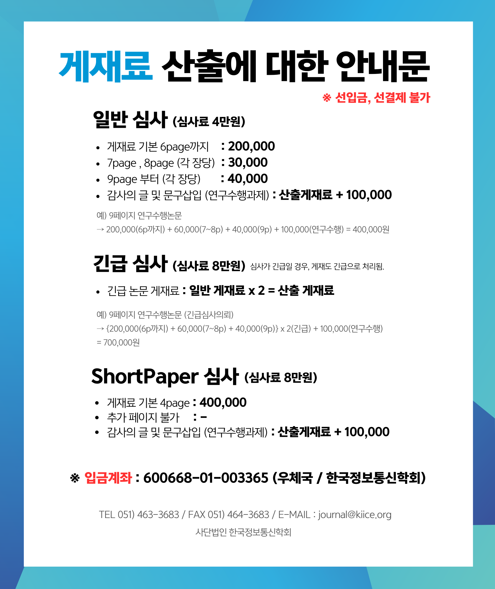 ※ 게재료는 선결제가 불가하며, 논문 게재 확정 후 메일로 추가 안내 드릴 예정입니다.